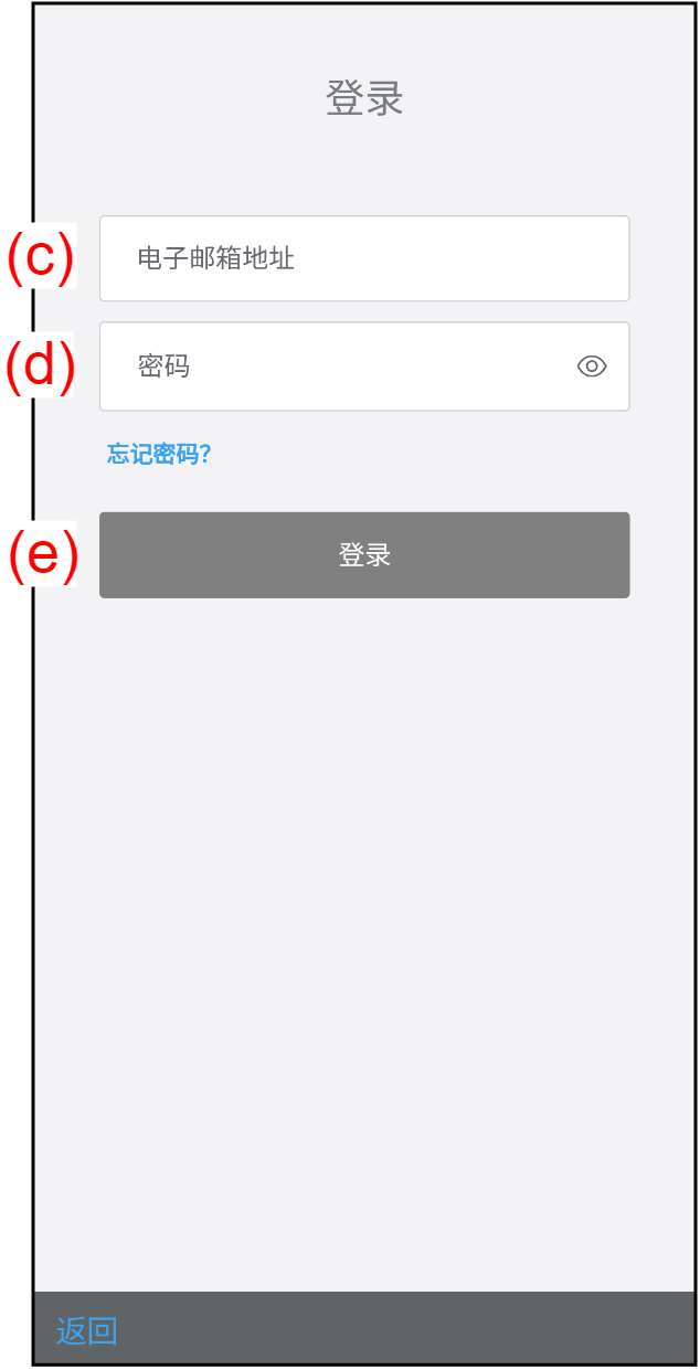 主页 启动本应用程序 登录 轻按[登录] (a)或[登录] (b)以显示登录画面。* 如果您有无线路由器,轻按[登录] (a)。* 如果您没有无线路由器,轻按[登录] (b)。 使用您已注册的电子邮箱地址(c)和密码(d)登录。 如果您有接入点,轻按(e)登录至本应用程序。如果您没有接入点,使用直接控制。参考“直接控制”了解详情。 注: 请勿同时从多台智能手机登录到一个帐户。登录会失败。 如果30天未使用本应用程序,您将自动登出。遵照画面上的指示,再次登录。* 即使您经常使用AIRSTAGE Mobile应用程序,您也会在初次登录一年后自动登出。 如果忘记密码,请参考“遗忘密码时”。